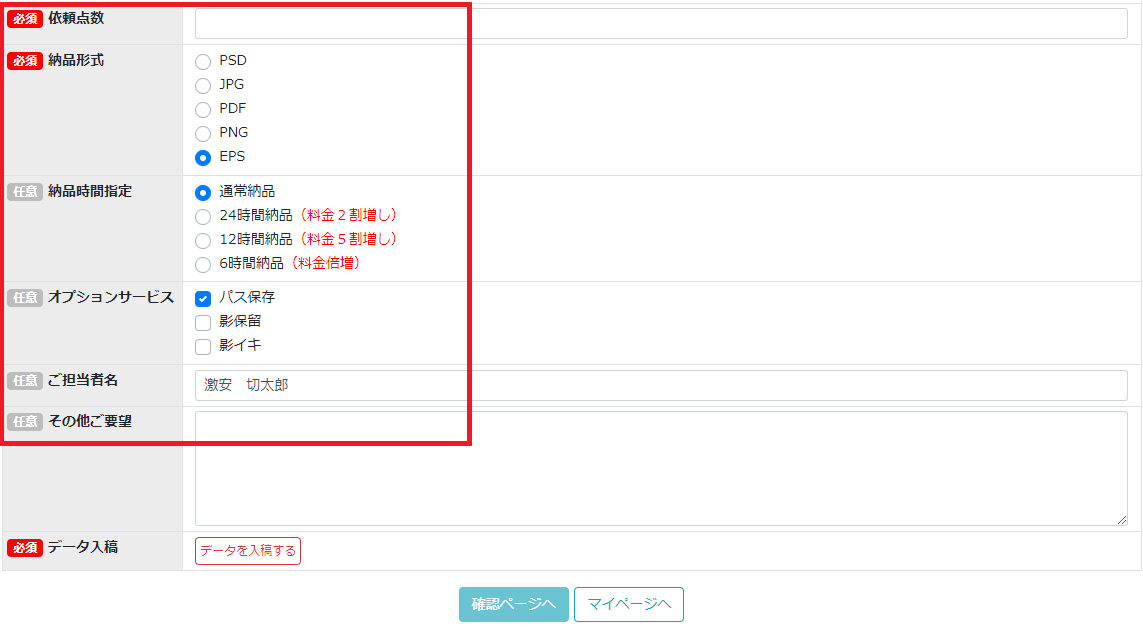お急ぎ納品やオプションサービスを希望する場合は、必要に応じて指定してください。