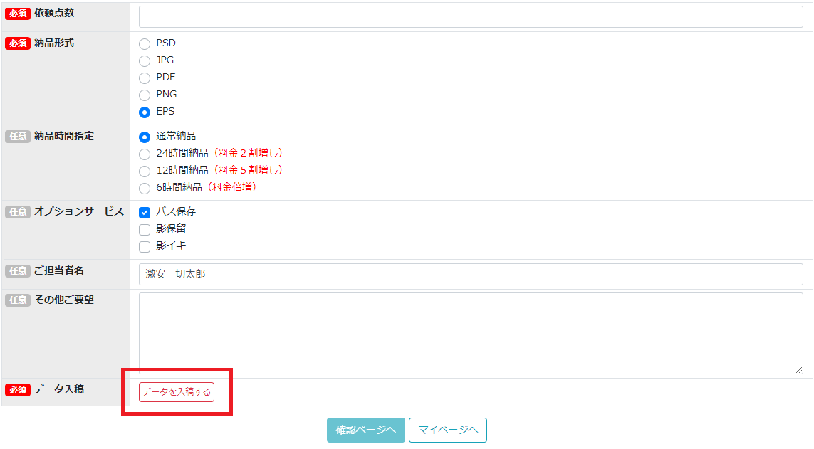 ログイン後に、依頼点数や納品形式などを指定して発注フォームに入力してください。