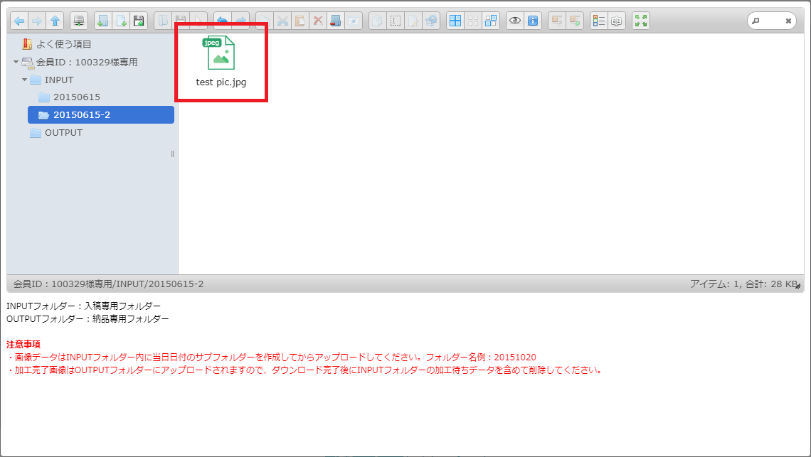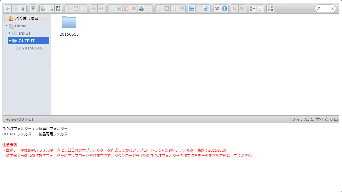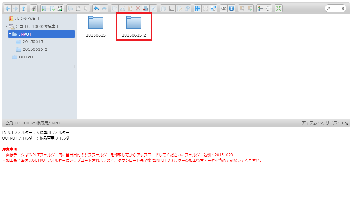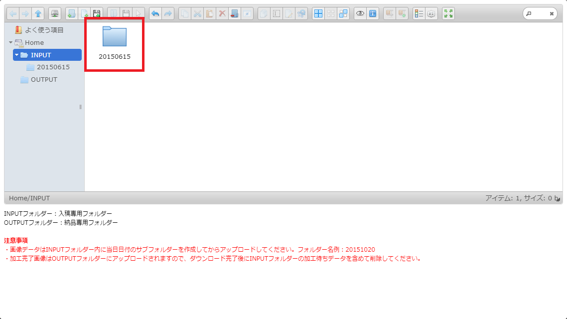 例えば、2015年6月15日に入稿する場合は、フォルダー名を「20150615」とし、INPUTフォルダーにアップロードしてください。